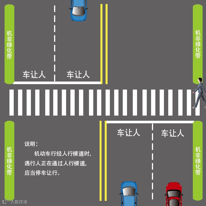 行人步入斑马线,第③车道车辆必须让行,行人开始通过斑马线,所在车道车辆和下一车道车辆必须让行,行人到达中央绿化隔离带或双黄线,下一车道车辆必须让行。