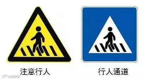 行人通道:黄底图标一般是行人比较多的地方,但是不一定有人行横道;白底图标是前方有人行横道,注意有行人。