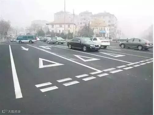 倒三角标线是由两条白色的平行虚线和一个倒立的三角形,这是减速让行标志。车辆在此处必须减速,让主干道车辆或过街行人先行。