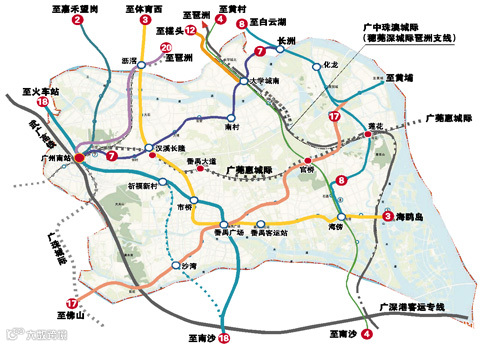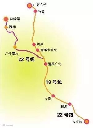 地铁条地铁线:除已开通运营的地铁二、三、四号线外,未来番禺境内还将建设地铁七、十二、十七、十八、二十号线以及八号线延长线。