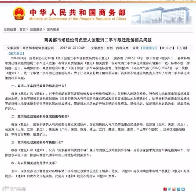 商务部网站1月22日发布最新消息,除国家明确的大气污染防治重点区域(京津冀、长三角、珠三角)之外,全国各地要求取消二手车限迁。通俗地讲,就是当地允许跑的车,就必须允许迁入。