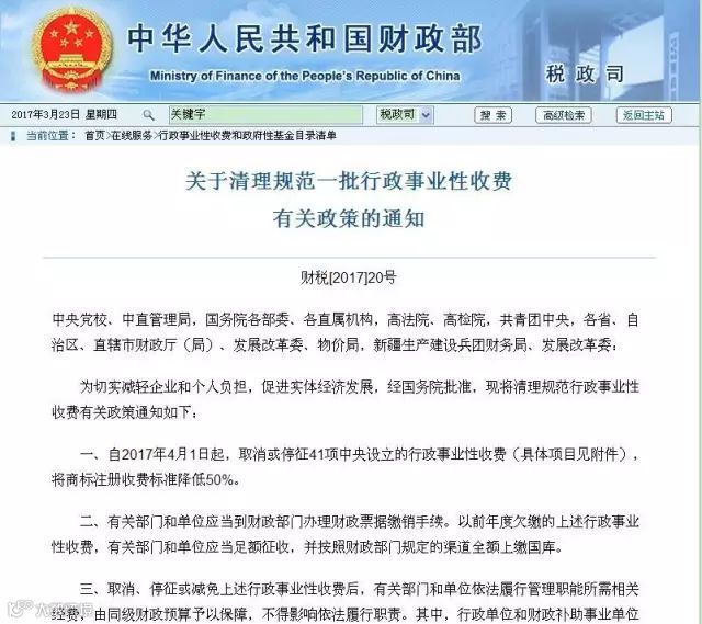 3月23日,财政部网站发布《关于清理规范一批行政事业性收费有关政策的通知》(下称《通知》),自2017年4月1日起,取消或停征41项中央设立的行政事业性收费,将商标注册收费标准降低50%。