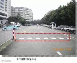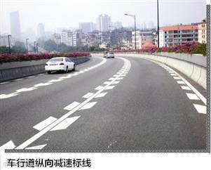 在收费站广场、出口匝道等路段都是可以见到纵向、横向减速标线的。这种标线为白色虚线,提醒司机在通过路段时需要减速慢行。