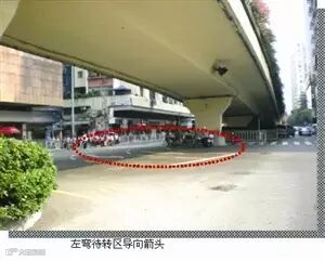 在左转弯车道或直行车道停车线前方,有一个延伸的虚线框,那就是等待区。在市桥大北天桥下方十字路口,有几个这样的等待区标线,在黄灯亮起后,车辆可以驶入等待区,绿灯亮时可驶离等待区。