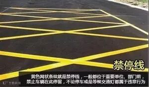黄色网状条纹标线就是禁停线,一般都位于重要单位、部门前,禁止车辆在此停留,在此不论停车或是等候交通灯都属于违章行为。