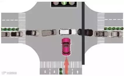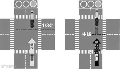 二、当前车已停在路口二分之一处时,即使是绿灯,后车也应在路口外等候,不要驶入路口;而当前车尚在路口三分之一内缓慢行驶时,后车则可缓慢前行。