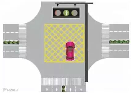 二、前方处于绿灯状态,将车停在路口画有黄色网格线(禁止停车区)范围内的。