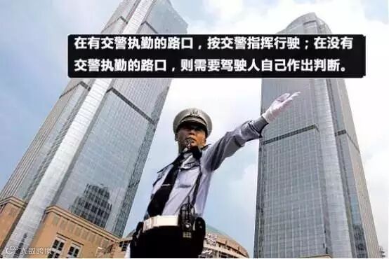 一、在有交警执勤的路口,按交警指挥行驶;在没有交警执勤的路口,需车主自己作出判断。