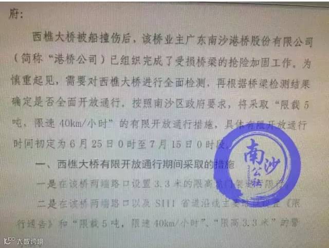 西樵大桥被过往船只撞到桥墩之后,