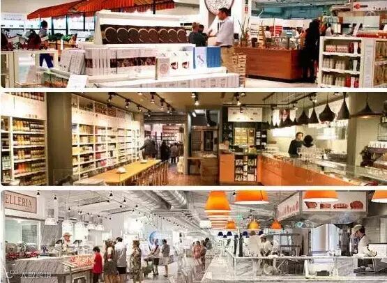 以纽约的门店为例,顾客可以坐在超市边吃烤肉边看电视,逛累了可以在咖啡柜台坐下喝杯咖啡,还可以去小图书馆里翻翻食谱。真正实现了吃货们“逛吃逛吃逛吃”的梦想!