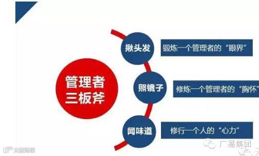 阿里巴巴管理的“三板斧”,指的是中高层管理者在组织中发展与成长的方法与思路,分别是“揪头发”、“照镜子”和“闻味道”,分别代表着一个中层的管理者,需要具备的三项最核心的能力:“眼界”、“胸怀”、“心力”。