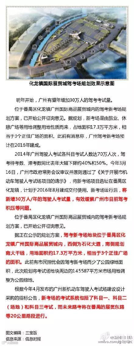 根据今年4月发布的广州新机动车驾驶人考试场建设设计采购的招标公告,新考场的考试系统包括了科目一、科目二(场地)和科目三考试,而未来路考将在番禺的展贸东路等20公里路段进行,新考场建成后能满足未来3至5年内广州市约30万人的年考试量,比现在岑村考场的考试量还大!