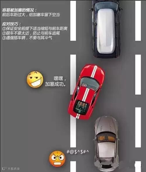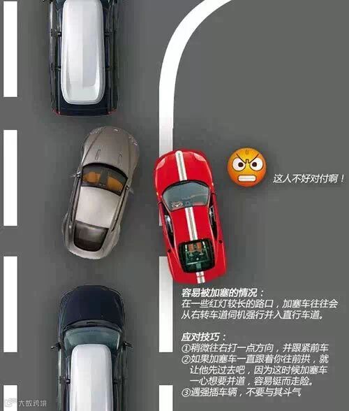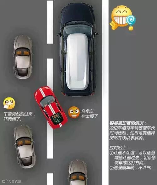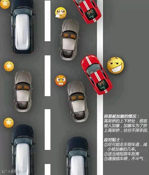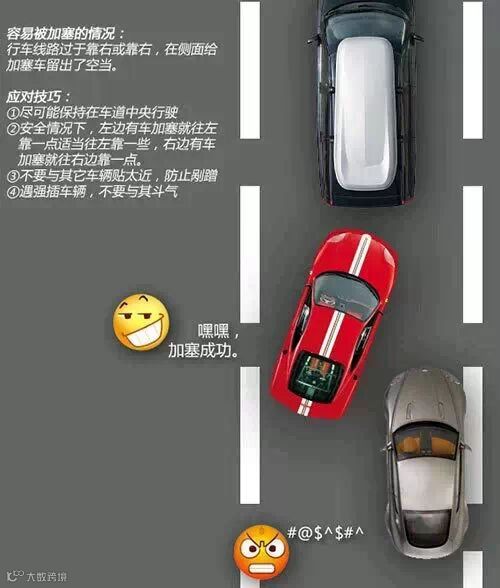 上面的图例列举了几种加塞行为最可能出现的场景,车友们在遇到这些情况时要尤其小心。不过切记凡事适可而止,留有余地,毕竟被人加塞一下也不是什么大是大非的事情,尽管自身可以采取一些措施减小被加塞的几率,但行车安全第一,绝不鼓励以暴制暴。如果遇到一些开车不管不顾,加塞时与你死扛到底的无德司机,建议还是让让他。争一口气事小,发生剐蹭事大,千万不要心存侥幸。更何况说不定加塞的司机真有急事呢,让让他又何妨。