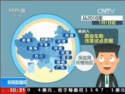 从2016年1月1日起,天津、内蒙古、吉林、安徽、河南、湖北、湖南、广东、四川、青海、宁夏、新疆等12个保监局所辖地区将纳入商业车险改革试点范围。