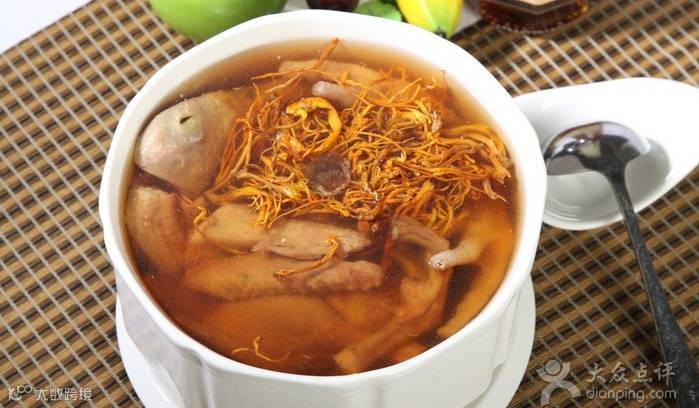 做法:冬虫草洗净,水鸭洗干净,放入滚水内煮5分钟,取出。陈皮净软刮去囊。水煲滚,将冬虫草、水鸭、无花果、陈皮、姜加入煲滚,改文火煲两个半小时,加盐调味。