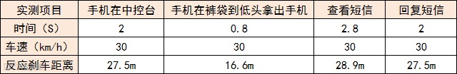 将车速保持在30km/h,并确保前方一百米内没有其他车辆,这时拿出手机并举起来,使手机与方向盘在同一水平面上,然后低头瞄一眼手机屏幕,并输入最简单的一个字,再抬头瞄一眼前方的路况,发现有紧急情况就立即刹车制停。这个过程需要2秒钟,行车距离约为27.5米。 从低头拿手机到打开短信并看内容这个过程做了一番测算,发现仅这个过程就需要6.3秒。而发短信的应急反应过程会非常长,即使是输入最简单的两个字(“好的”)也需要用时2.9秒,车辆这时候已经开过了近20米。尝试输入字数稍多的一句话(“迟点回你”),需要花费5.6秒。 收发短信整个过程的用时已经超过了10秒。可见一旦旁边有车变道,或者有行人横穿马路,根本反应不过来。