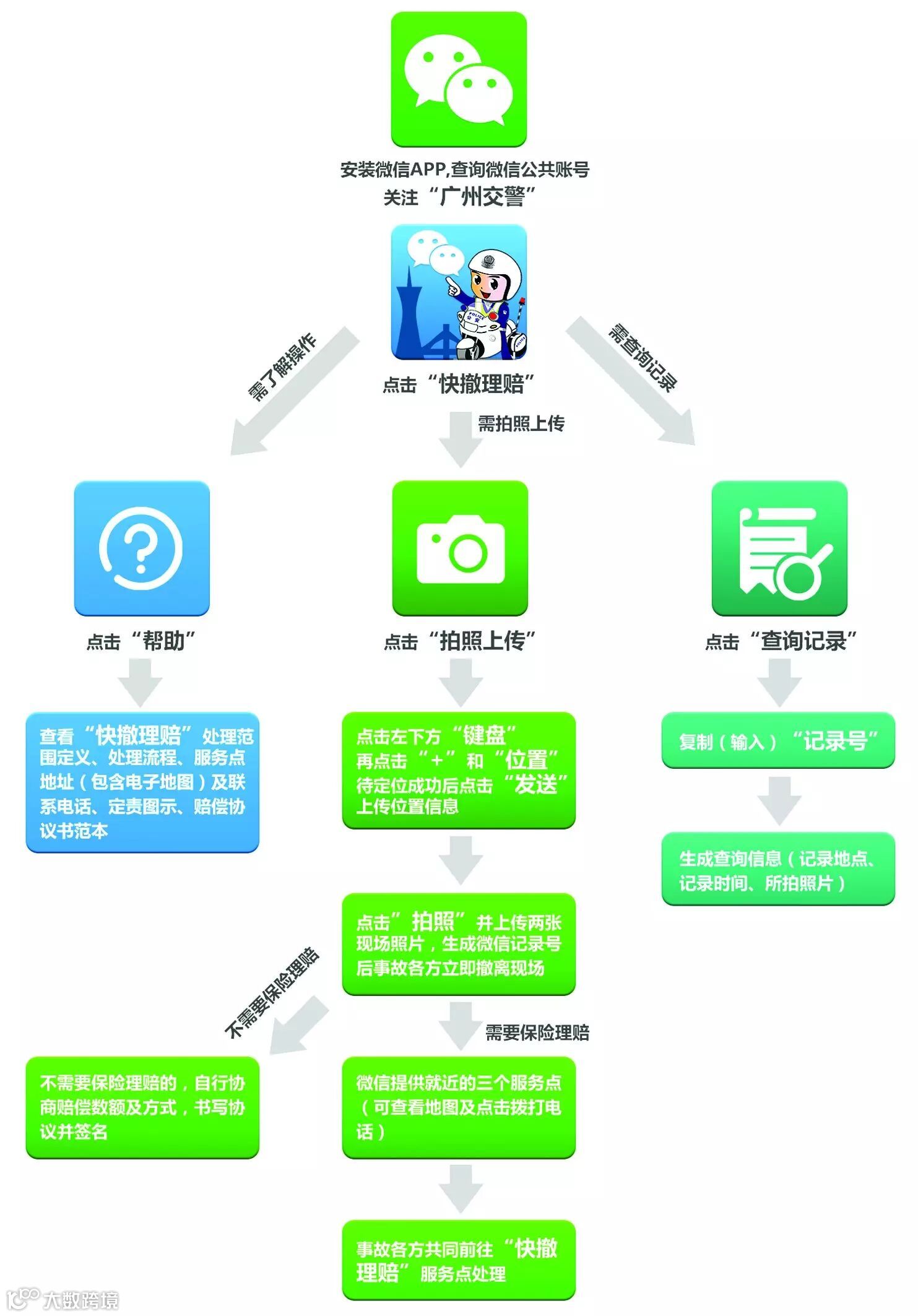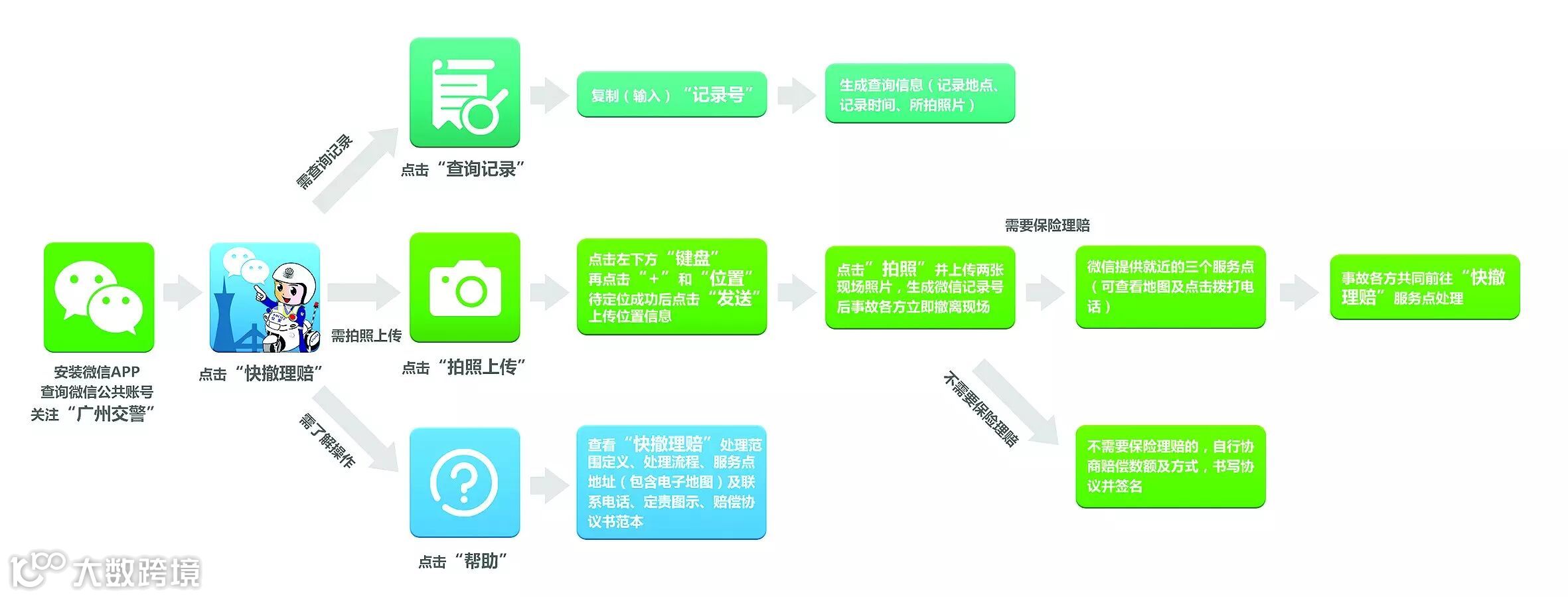 为使“快撤理赔”和自行协商处理更便捷,市民可通过“广州交警”微信平台根据相关指引自行处理轻微交通事故。