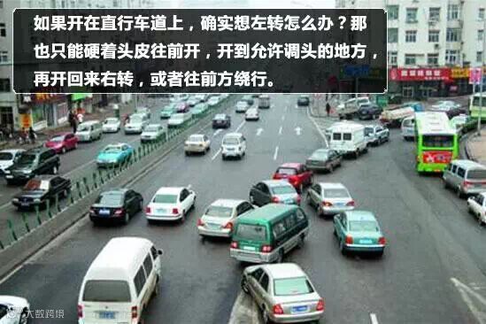 如果开在直行车道上,确实想左转怎么办?那也只能硬着头皮往前开,开到允许调头的地方,再开回来右转,或者往前方绕行。