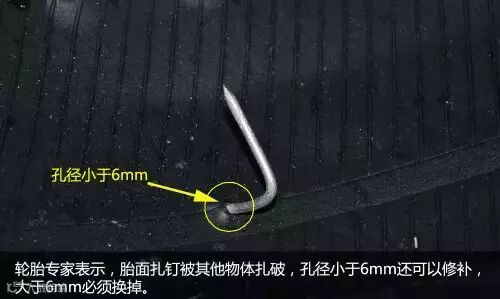 胎面扎钉或被其他物体扎破,孔径小于6mm还可以修补,大于6mm必须换掉。由于铁钉的直径不大,但伤得比较深,所以被铁钉扎过轮胎的车主们,跑高速或走远路前要检查受过伤的轮胎状况,方可上路。