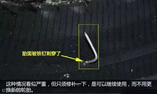 这种情况看似很严重,但仔细分析后发现其实只须补一补胎,也可以继续使用无需更换。因为,铁钉插入轮胎不会很大程度的损伤轮胎的结构,钢丝、帘布和聚酯层只是穿了四个洞,修补一下就完事了。当然更安全的是换掉它,然后把受伤的轮胎当做备胎用。