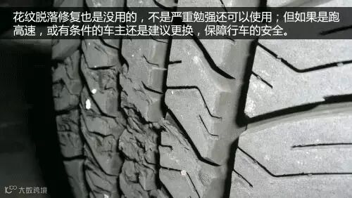 有些轮胎的胎面接触到锋利的物体,花纹严重脱落或胎体被割裂。当被扎胎面的孔径超过6mm后,再修补就已经失去意义了。被扎的轮胎必须换掉,确保行车的安全。