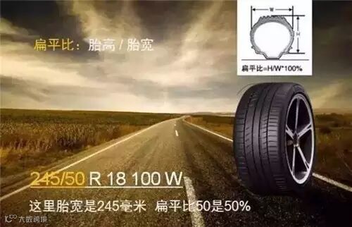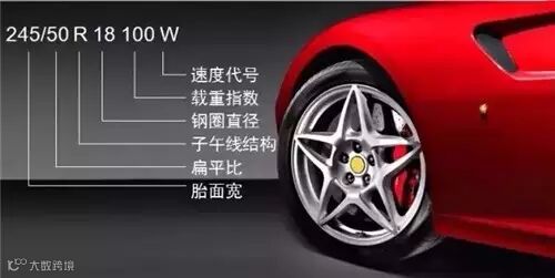 轮胎规格有严格的规范,轮胎侧面都会标示的很清楚,如胎面宽、扁平比、钢圈直径、载重指数、速度代号等。