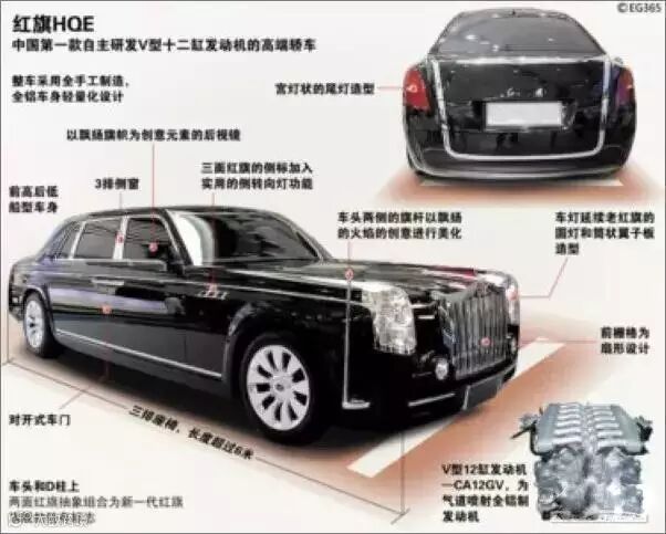 红旗的HQE车型被选定为2009年国庆60周年庆典的阅兵用车,主席乘坐着它检阅十年一度的盛大建国六十周年阅兵仪式,是因为HQE顶级红旗汽车定位于“元首级”,长度超过6米,延续了三排座椅的传统。该车的外观设计从整体风格到每一个细节——车标、车灯、格栅,处处体现中国文化特色,蕴涵着中国式的尊贵。红旗HQE在技术上追求极致,整车采用全手工制造,全铝车身,轻量化设计,可以满足使用者个性化需求,尊贵独享。
