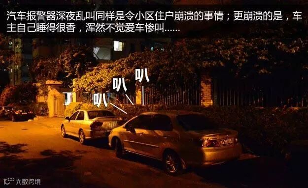 除了深夜鸣喇叭惹人厌外,汽车报警器深夜扰民也是很令小区居民头痛的现象。晚上停放在小区的汽车很多,一些安装了报警器的汽车,被小猫小狗轻轻一碰,或附近的声音稍微大些,就会叫个不停,在深夜听见那急促刺耳的声音,简直让人崩溃。