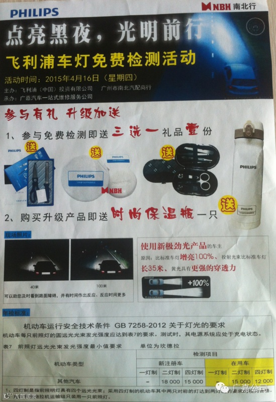 1、2015年4月16日参与飞利浦车灯免费检测活动即可送三选一礼品壹份,