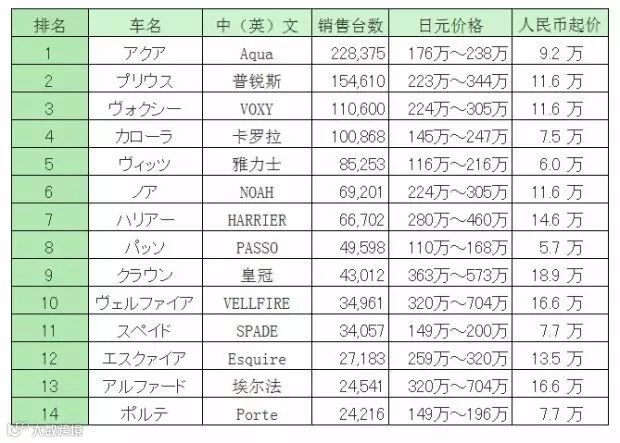 前面介绍丰田在日本销量最多的主力车型。从中我们可以看到,由于用车文化的不同,日本的人气车型主要为MPV车型、混合动力车型、小型车。14款车型的信息汇总如下。