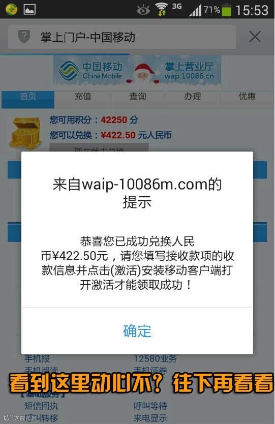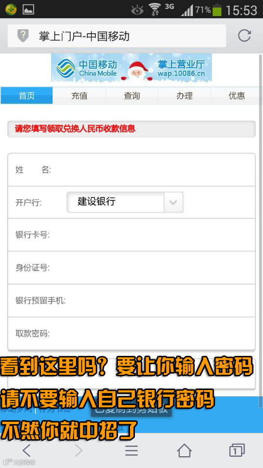 所以,在此提醒各位手机用户要小心,不要贪小便宜,以防受骗,没经验的用户看到网址是10086字眼就以为是真的,但大家看清楚,上面还有一个m字的,是10086m.com,很明显这是一个钓鱼网站,千万不要按上面的方法操作,不然你会损失惨重!