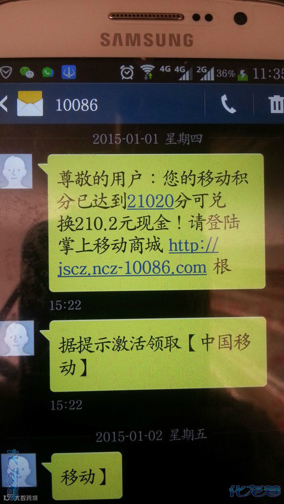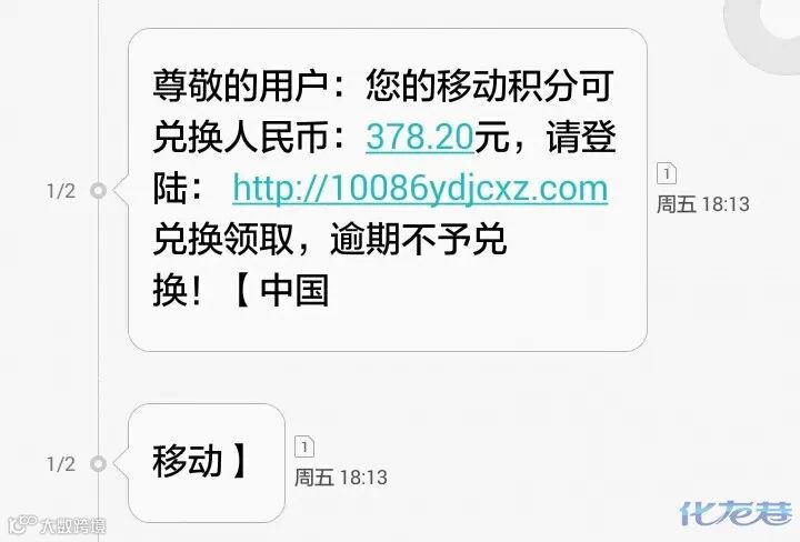 最近很多人收到以下手机信息:“尊敬的用户:您的手机话费积分已满兑换*****元现金条件,手机登陆http://waip-10086m.com/兑换。发件人竟然写着10086,为此警方联系过中国移动,告知这是伪基站发出的信息,是最新型的诈骗手段!