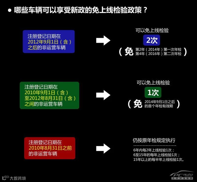 而在2010年8月31日之前注册登记的非营运轿车,仍执行原检验规定(即2年线上检验一次)。