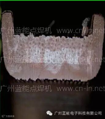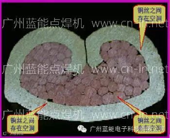 导线采用中频逆变直流电阻焊接是通过相邻金属表面熔化,形成金属分子层之间的熔合,相当于将相邻金属熔为一个整体,相比端子压接后相邻铜丝仍为独立金属个体而言,焊接部位的密实度更好,不会出现空洞(如图示)。导电性好,电阻系数极低或近乎零,有效提高了使用耐久性,不易发热,无质量隐患。因此中频点焊机直接焊接导线的工艺是最佳选择。