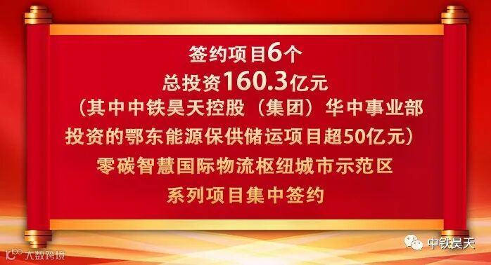 2022年9月16日,中铁昊天控股集团华中事业部总裁段利华、华中事业部总经理胡少波受邀参加鄂州市零碳智慧国际物流枢纽城市示范区项目签约仪式,与涉及金融投资、石油化工、能源物流、数字信息等的多家企业组团,共签约项目6个、总投资160.3亿元,涉及能源供应链、现代物流、新能源汽车等领域。其中第一个签约的是中铁昊天控股(集团)有限公司投资50亿元的鄂东能源保供存储项目。