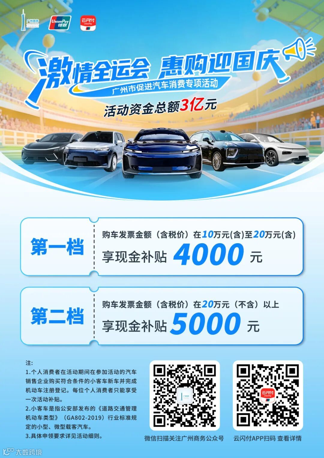 广州市“激情全运会 惠购迎国庆”促进汽车消费专项活动,作为广州市人民政府主办的2025广州国际购物节的重磅活动之一,联动全市汽车、金融、电商、零售等多方市场主体,充分发挥汽车消费的积极作用,全面增强广州国际商贸中心功能。据悉,本轮活动资金补贴总额3亿元,有望带动汽车销售超80亿元。