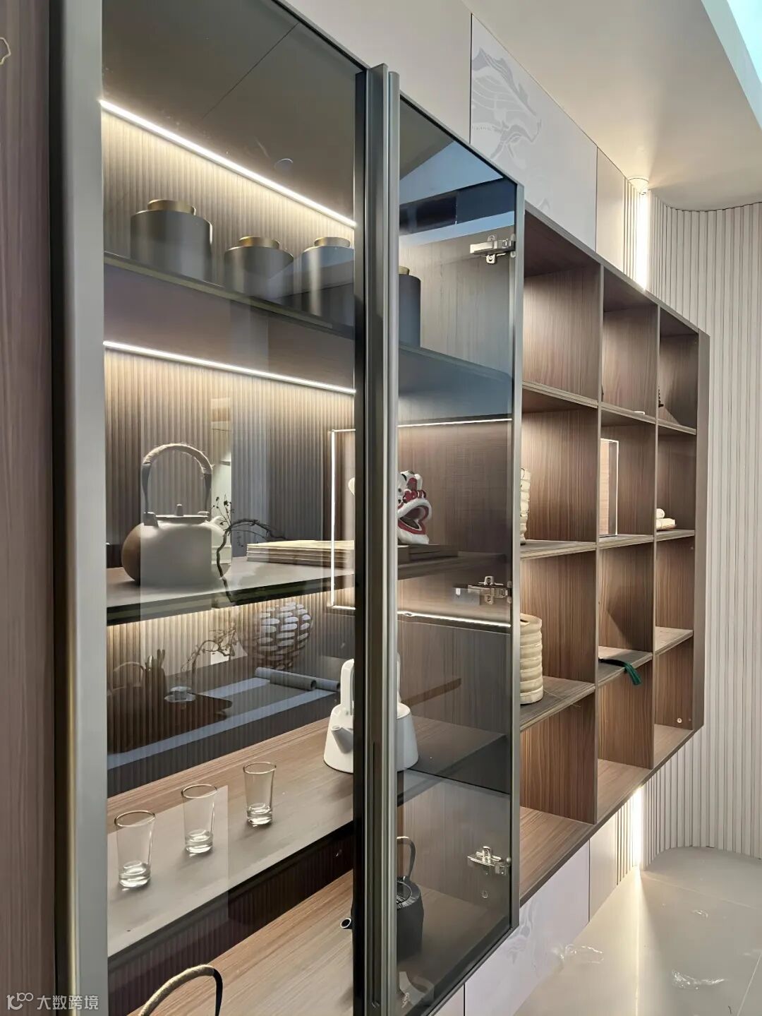 褐色的弥沙金胡桃柜体,搭配羽影灰PET柜门,像羽化的影子在墙上影影绰绰。