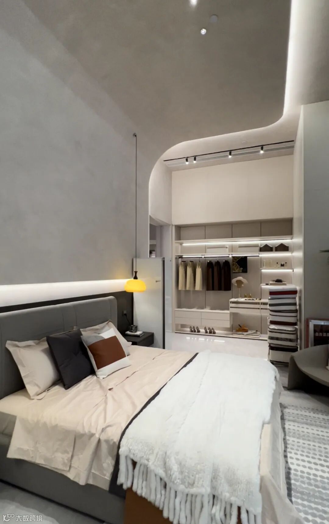 这是霸道总裁的卧室。简单圆弧床屏设计,和房型相得益彰。