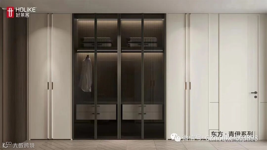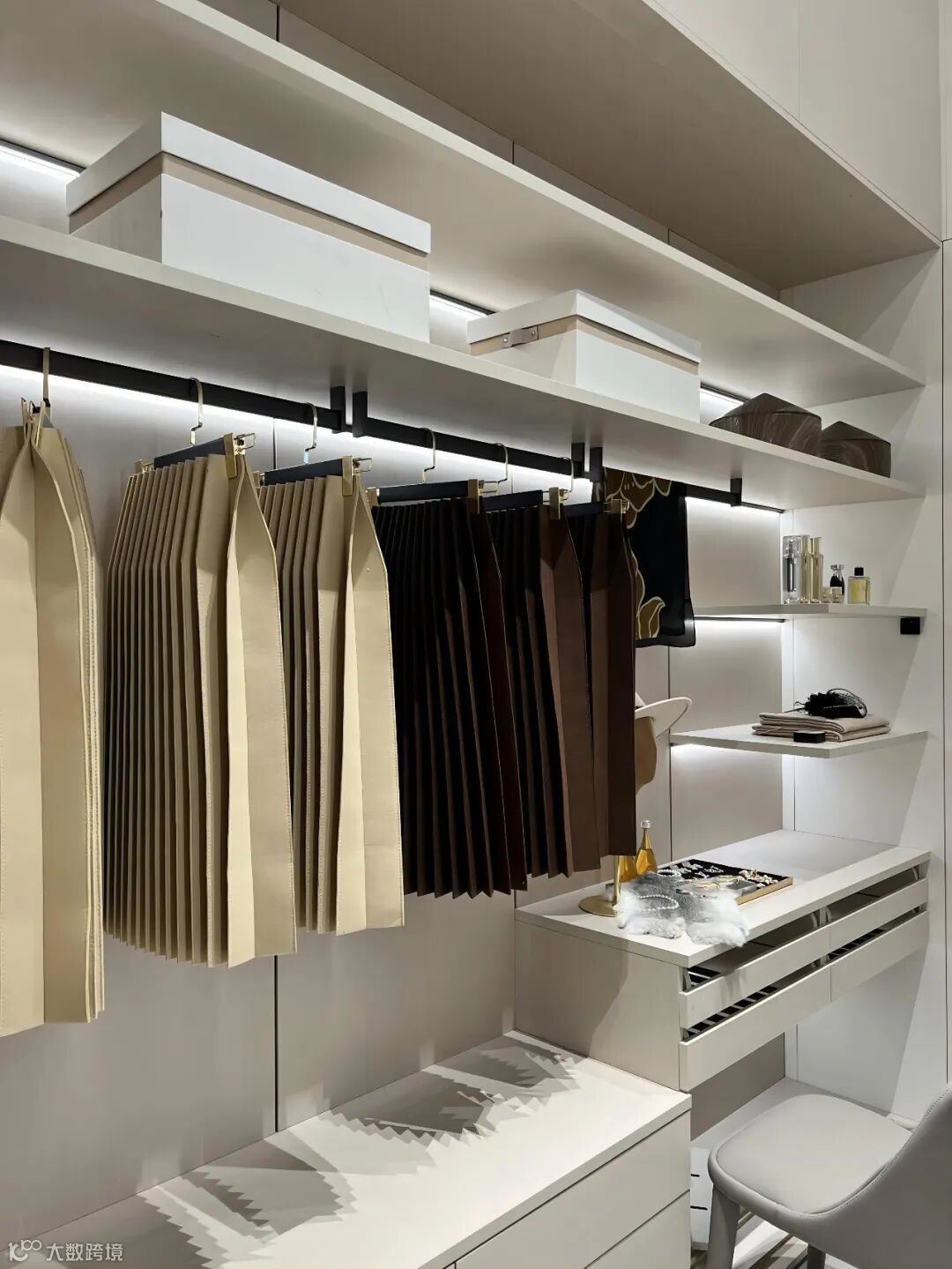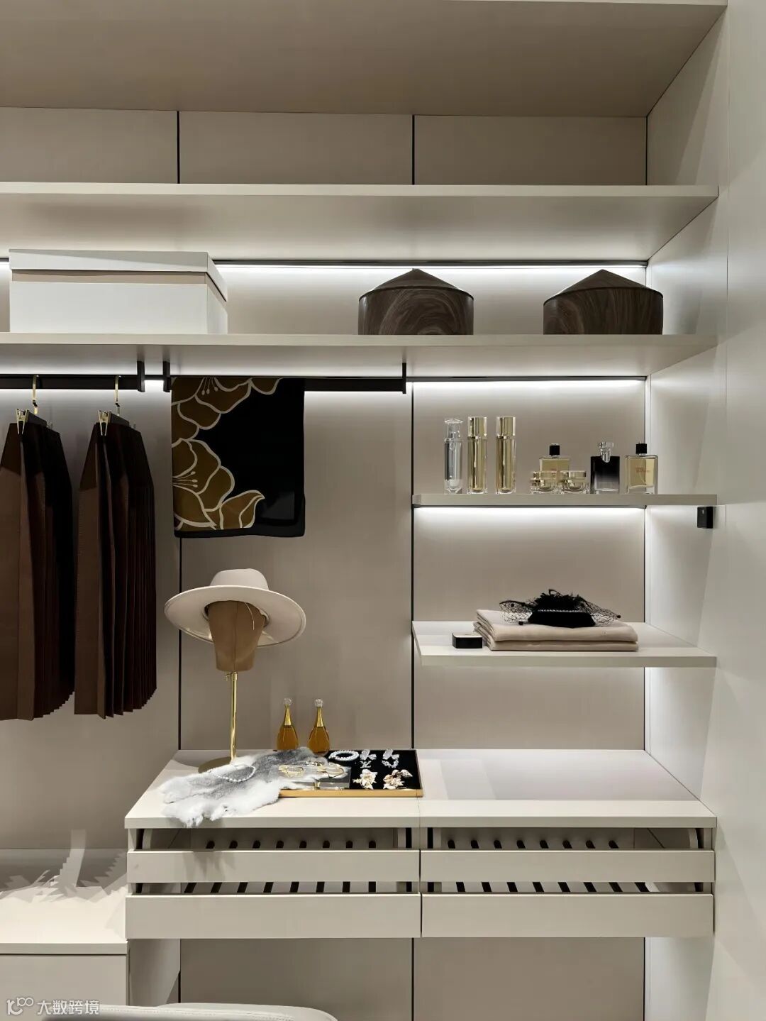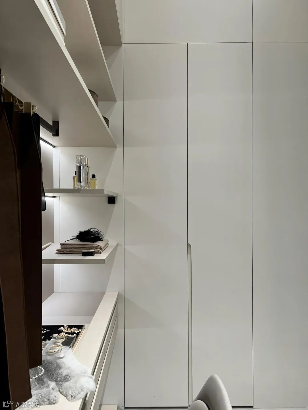 漂亮的长裙、悬挂的围巾、挂放的裤子,贴身的衣物,都有自己的位置,抽屉、裤架、饰物架,样样归整。左边娇妻衣帽间,床的右边,必定是霸道总裁的封闭衣柜。