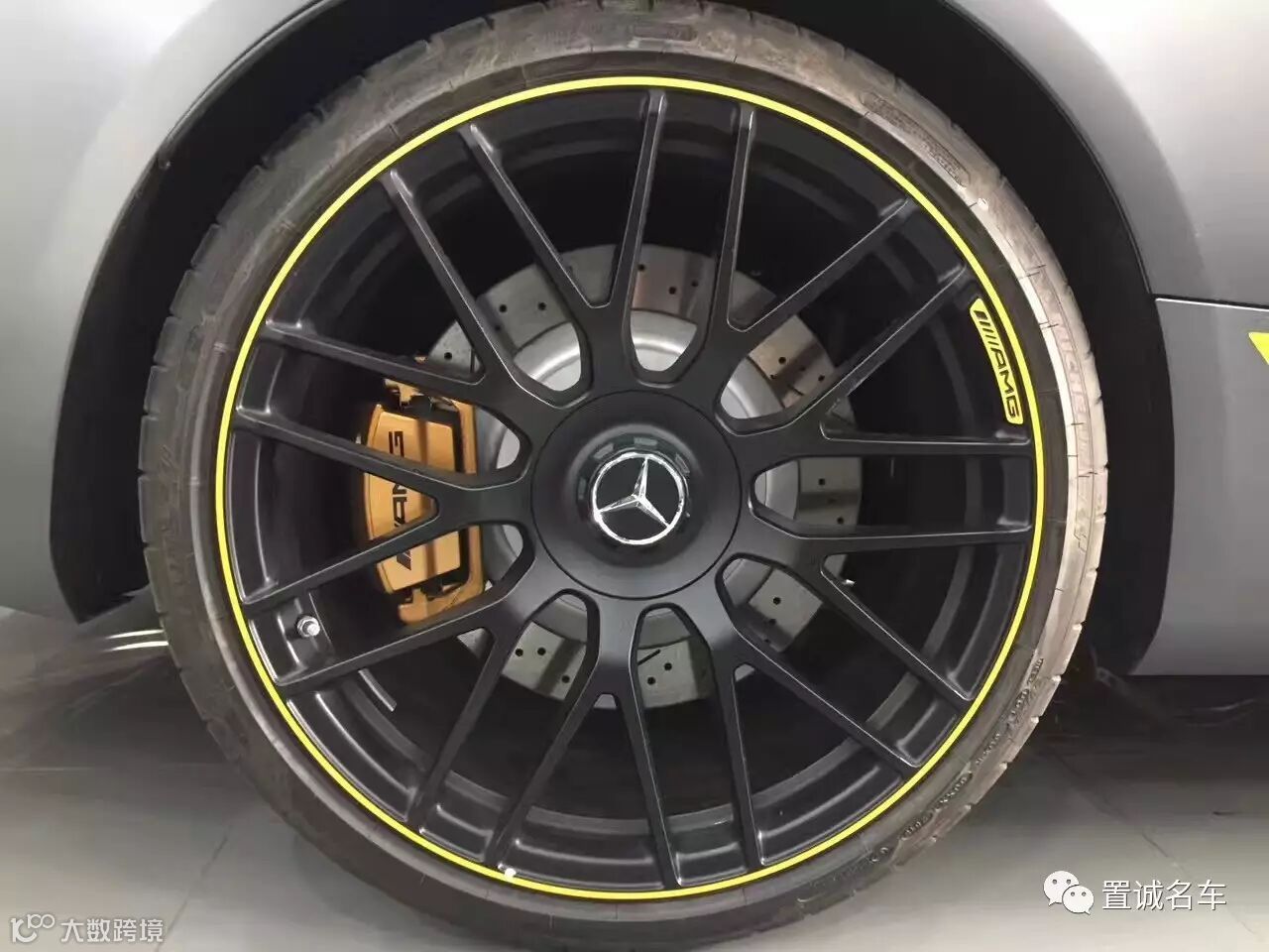 AMG哑光表面双5辐锻造轮毂搭配黄色轮缘,是新车的另一个醒目亮点。前轮采用255/35 R19轮胎,后轮则是285/30 R20轮胎。专属的运动型轮胎显著提高了汽车在干燥路面上的抓地力。AMG C 63轿跑车中国特别版采用了AMG高性能陶瓷复合材料制动系统,不仅带来更高效的制动能力,还降低了整备质量,进而提高了汽车在赛道上的性能。