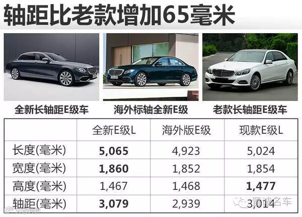 车身尺寸上,全新长轴距E级车相比上一代车型以及海外车型都加长不少,车身长度为5,065毫米,轴距较标准轴距车型增加140毫米,达到3,079毫米,加长的部分全部用在了后排乘坐空间。