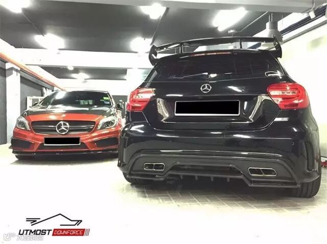 这套RevoZport和Mulgari针对A45 AMG设计的专用空气动力套件,包含了全新设计的碳纤维前唇、熏黑进气格栅、发动机盖、碳纤维侧裙、后下扰流板以及类似Edition 1版本的扰流尾翼等。