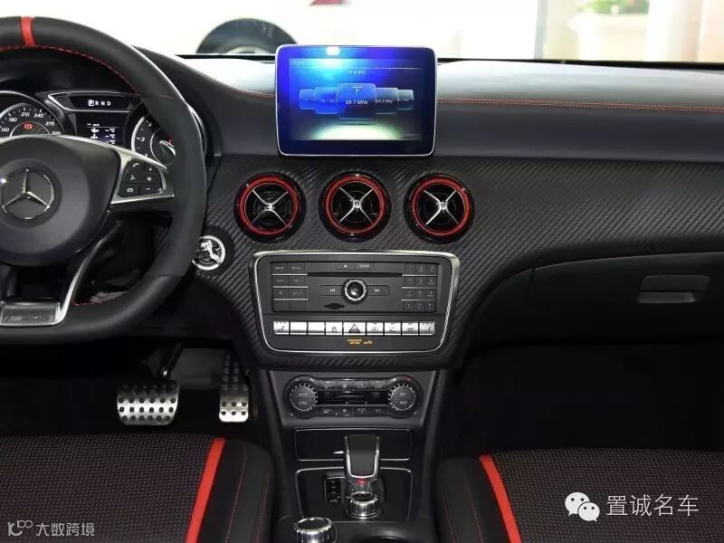面板覆盖一层碳钎维材质,显得整洁并且硬朗,搭配金属材质的按键机械感极强,从细节上烘托出A 45 AMG强烈的动感气息。
