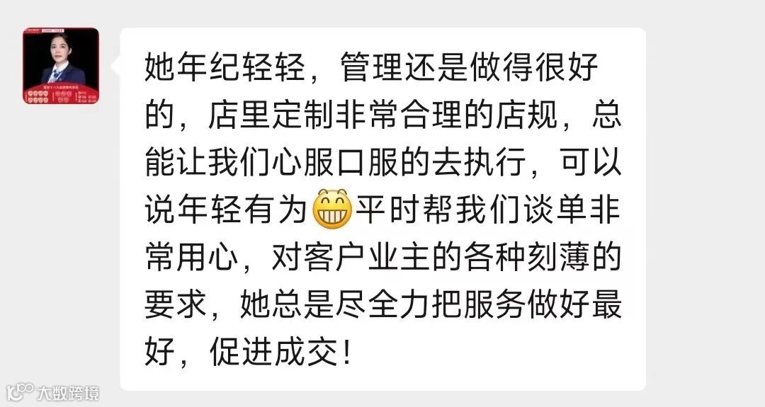客户对她的评价:让我感觉很信任,效率很高,做事有头有尾,有反馈必有回应。