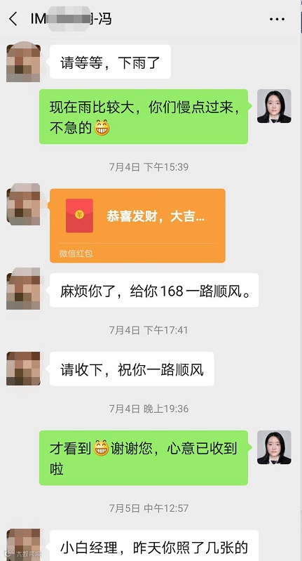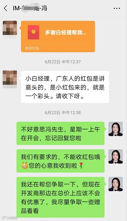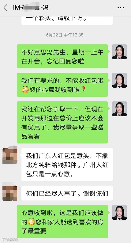 白皙在与冯先生服务沟通中,对方多次提出想要表示对她的感谢,为了表达感谢,冯先生给白皙发了一个微信红包,她断然拒绝并表示:只要为客户找到合适的房子就是对自己最大的鼓励。