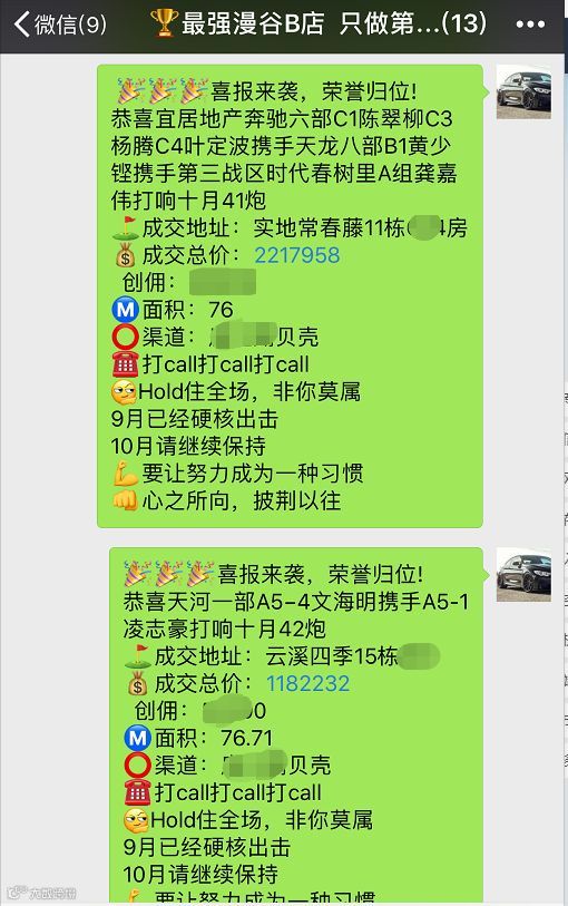 同时,凡是在置家大群上成交一手单“喜报”都会截图发在团队群中,有图有真相,更能刺激队员,在多重的方面严抓,队员也慢慢重视一手单。