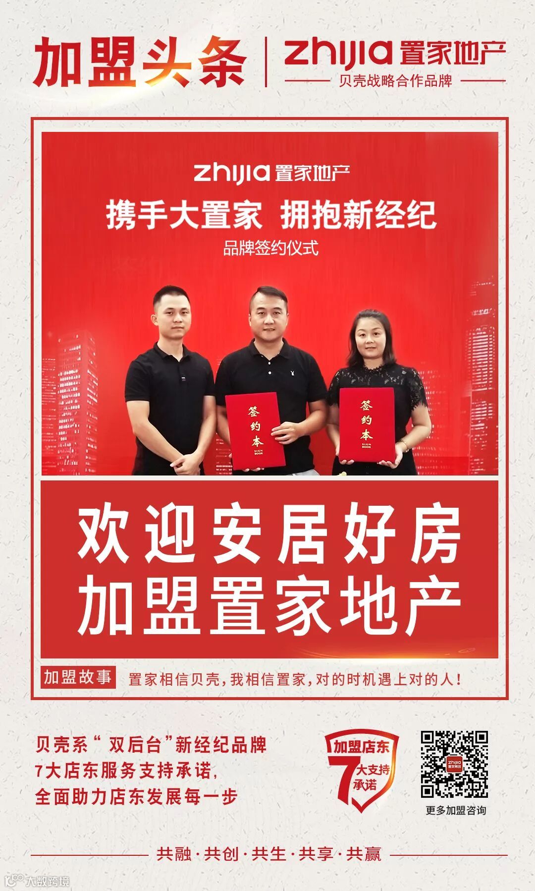 我之前也有对比过其他品牌,去过其他公司考察了解,最后经过再三思考还是选择加盟置家地产,主要是看中置家的“双后台”和“7大服务支持承诺”。