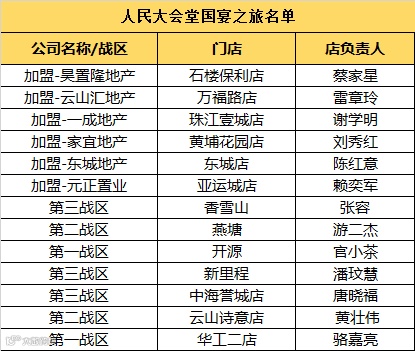 此次入围人民大会堂国宴名单中,6家加盟门店店东成功入选:石楼保利店蔡家星、万福路店雷章玲、珠江壹城店谢学明、黄埔花园店刘秀红、东城店陈红意、亚运城店赖奕军。