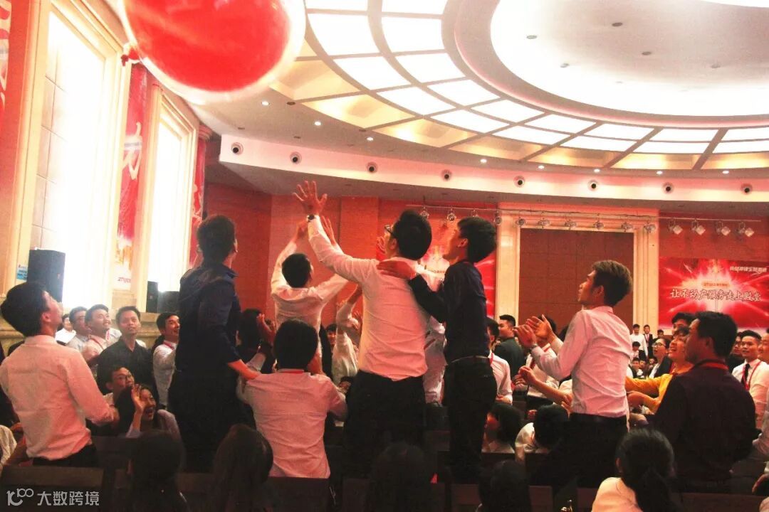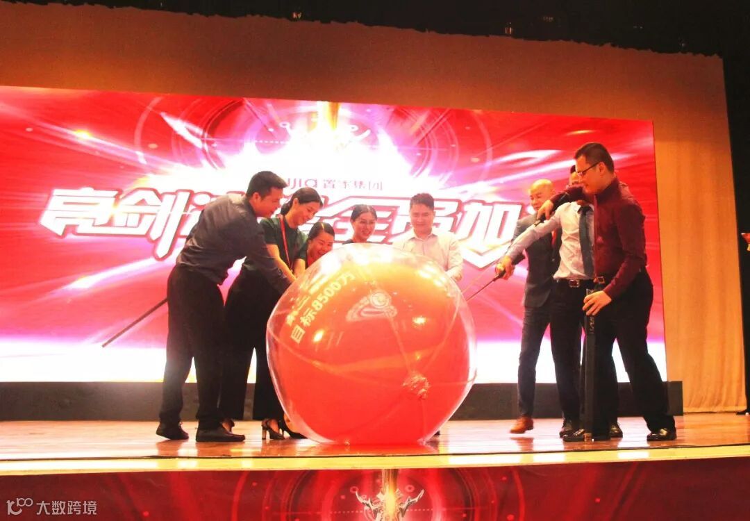 在全体人员推动下载着全员目标的气球回归舞台