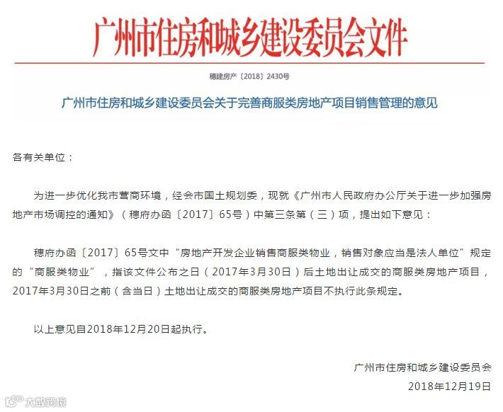 12月19日晚,广州市住房和城乡建设委员会发布“关于完善商服类房地产项目销售管理的意见”,指出2017年3月30日前(含当日)土地出让成交的(以签订土地出让合同、成交确认书或经公告确认土地出让成交日为准)房地产项目,其商服类物业不再限定销售对象,个人购买商服类物业取得不动产证满2年后方可再次转让。